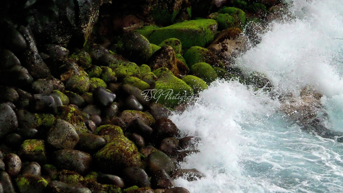 Image capturing waves crashing upon moss covered rocks in Mauritius.