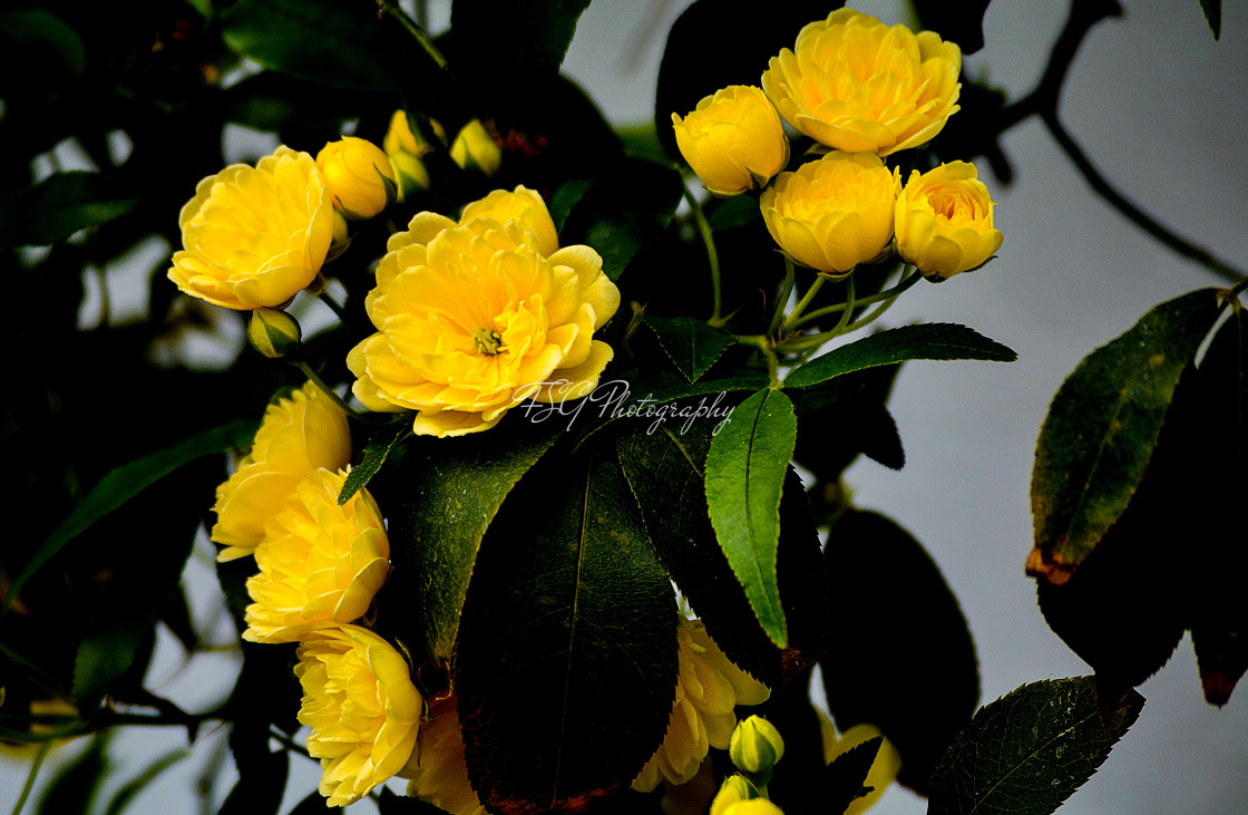 Close up shot of a bouquet of yellow roses in bloom.